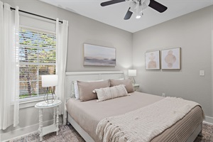 Bedroom 2 & Bath 2: King Suite with private balcony/ The private attached bathroom features a shower/ tub combo.