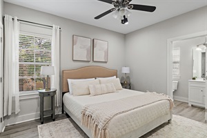 Bedroom 1 & Bath 1: King Suite/ The private attached bathroom features a shower/ tub combo.