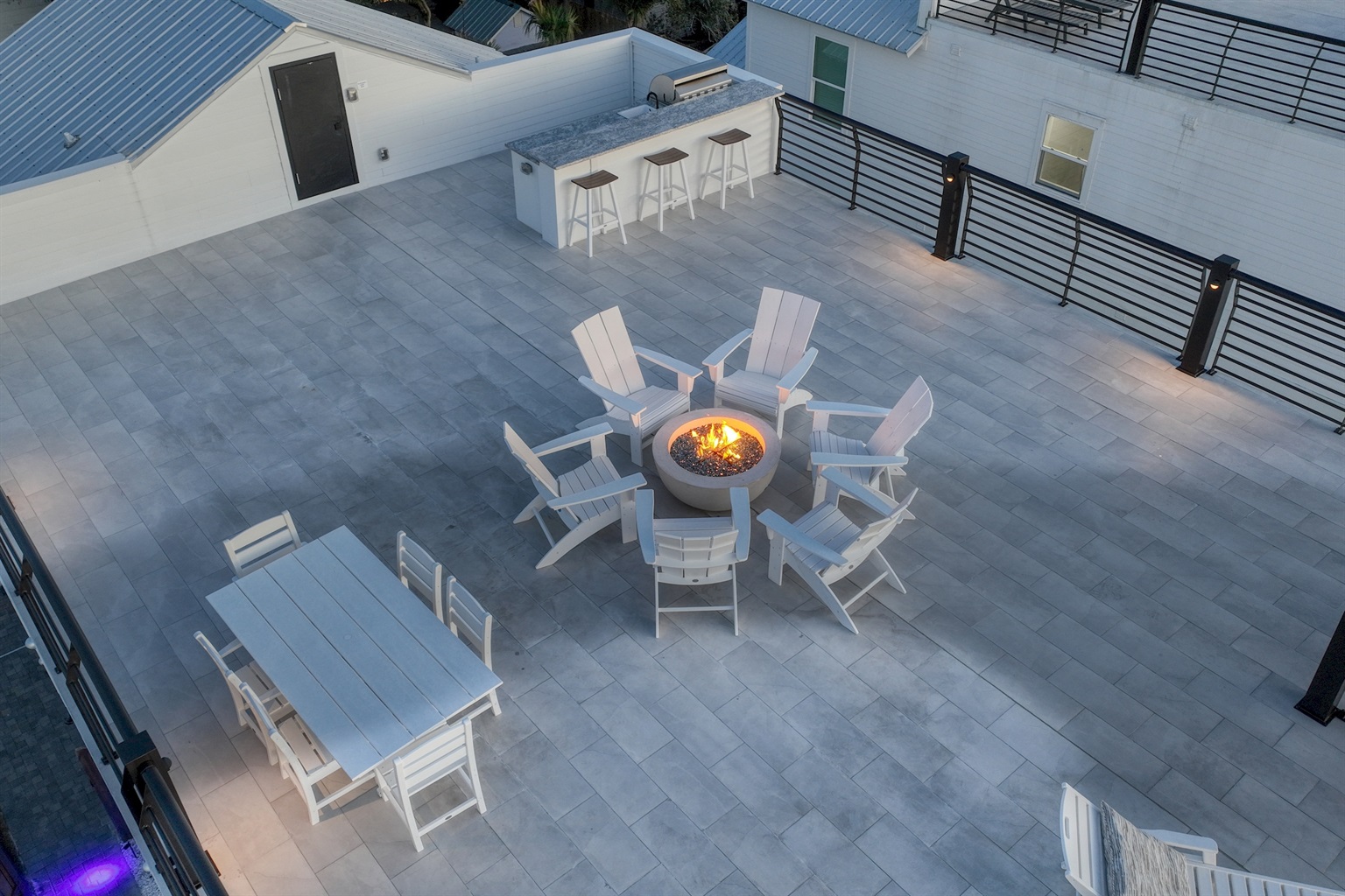 * Sleek lounge seating surrounding a modern concrete fire pit (wall-switch operated)